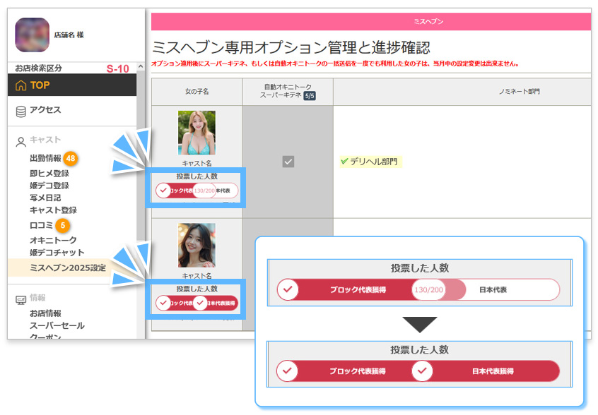 ▼マネージャー画面では、キャストごとの投票人数の進捗を確認することができます。