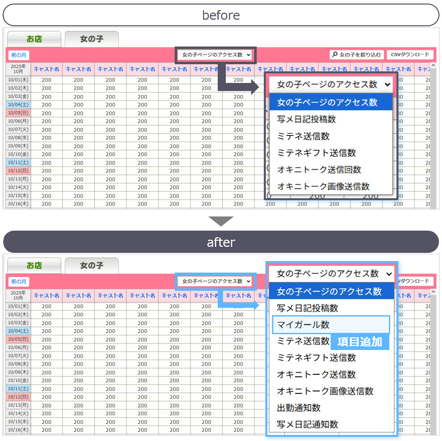 プルダウンに、『マイガール数』の項目を追加します。