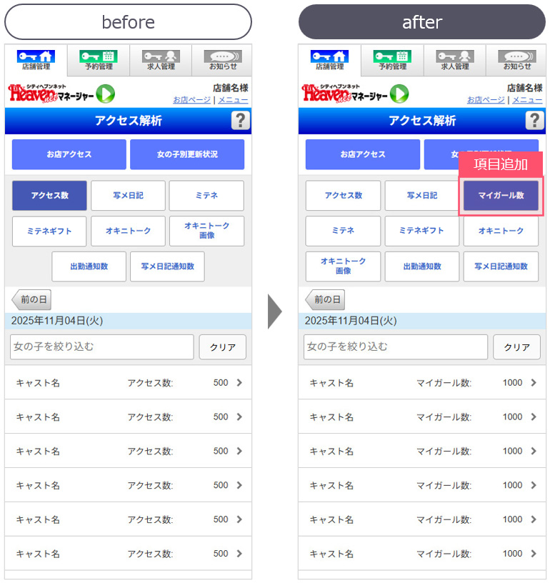 2025.12.8(月)に、PCおよびスマホ版管理マネージャーの女の子統計情報に、『マイガール数』項目を追加します。