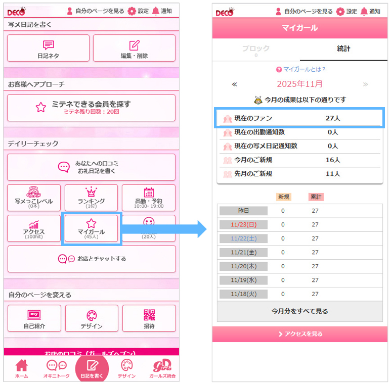 アクセス画面に『マイガール数』の項目を追加します。