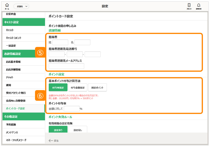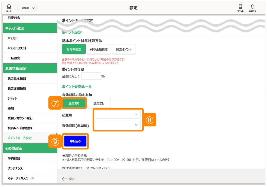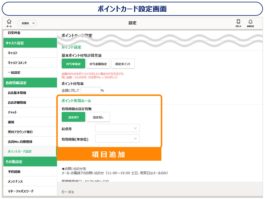風俗ヨヤクのポイントカード設定画面に、来店ポイントの有効期限を入力できる項目を追加します。
