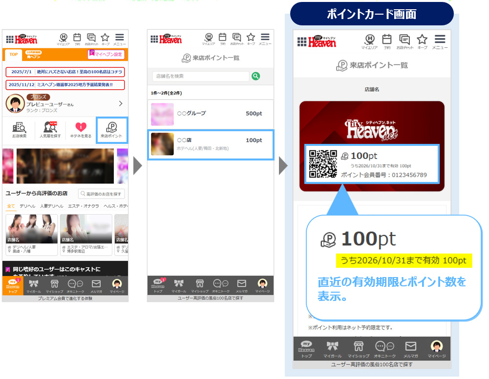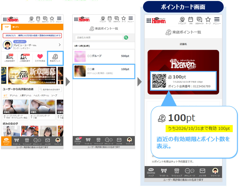 来店ポイントを保有しているユーザーに、直近の有効期限とポイント数が表示されます。