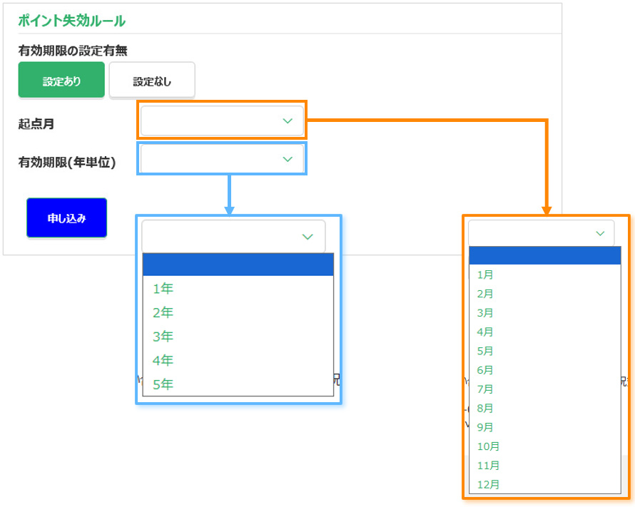 そのため、店舗ごとに『起点月』と『有効期限(年単位)』の設定を行って頂く必要があります。