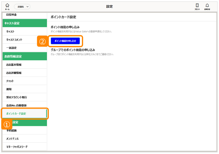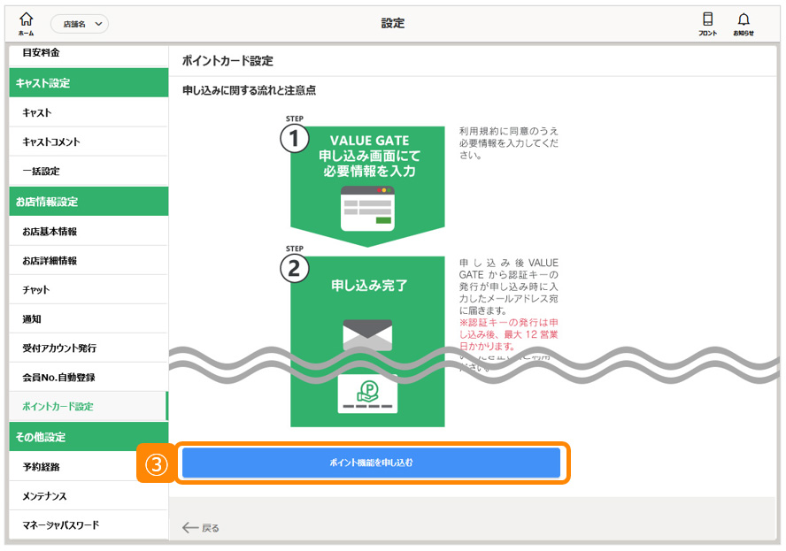 来店ポイントの機能開放後、利用設定やポイントカード画像設定などの操作が必要です。