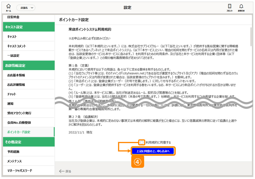 ④.来店ポイントシステム利用規約を閲覧後、利用規約に同意する項目にチェックを入れる⇒[上記に同意の上、申し込みへ]を押します。