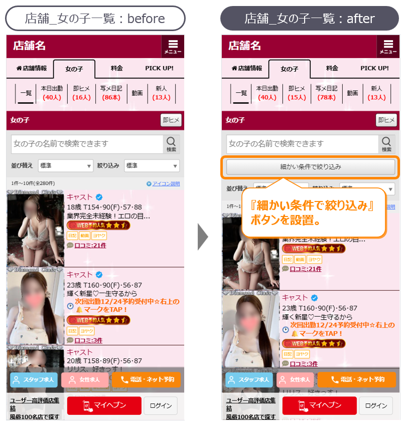 2026年1月8日(木)に、スマホ版の店舗_女の子一覧ページに『細かい条件で絞り込み』ボタンを設置します。