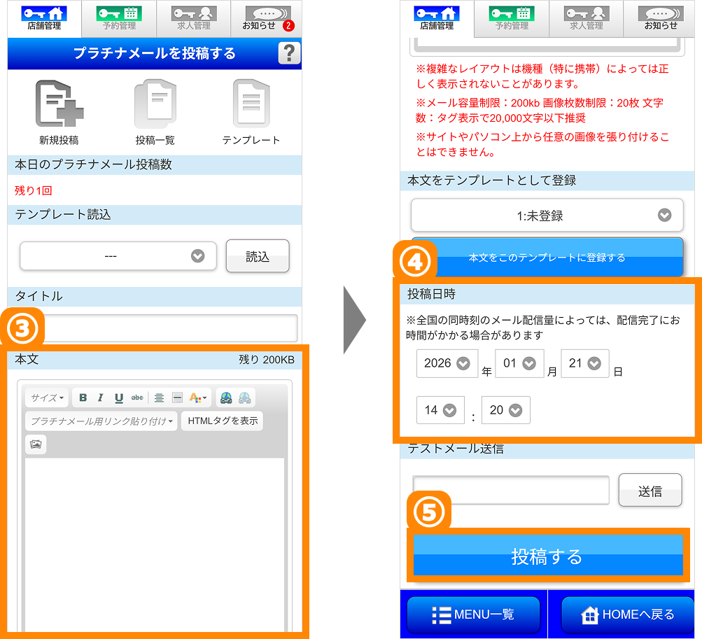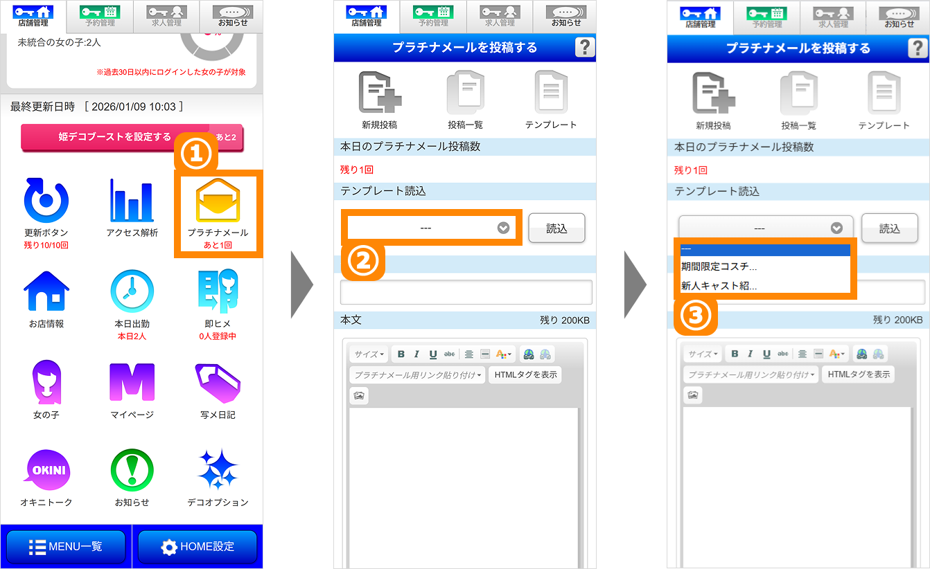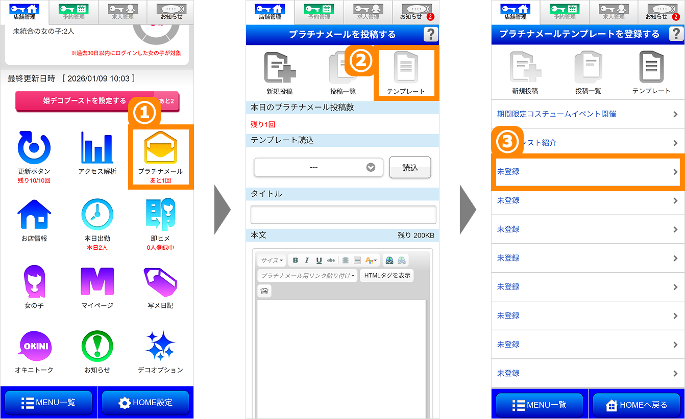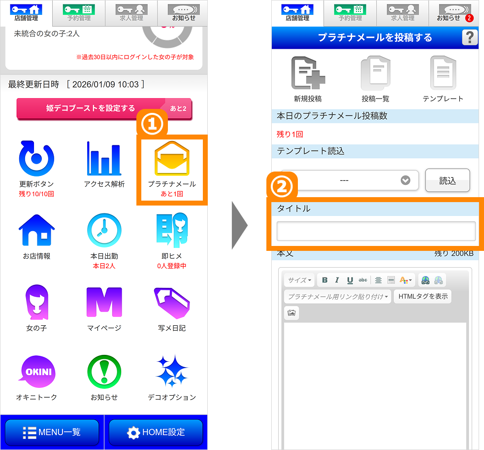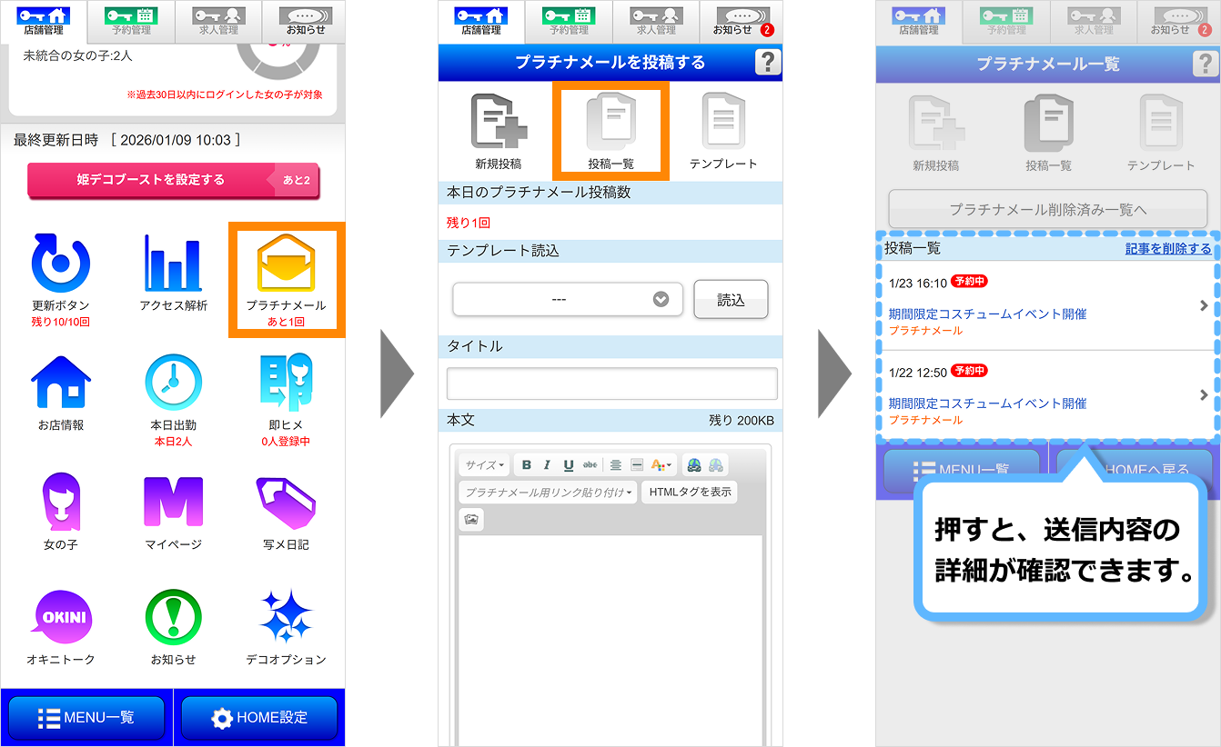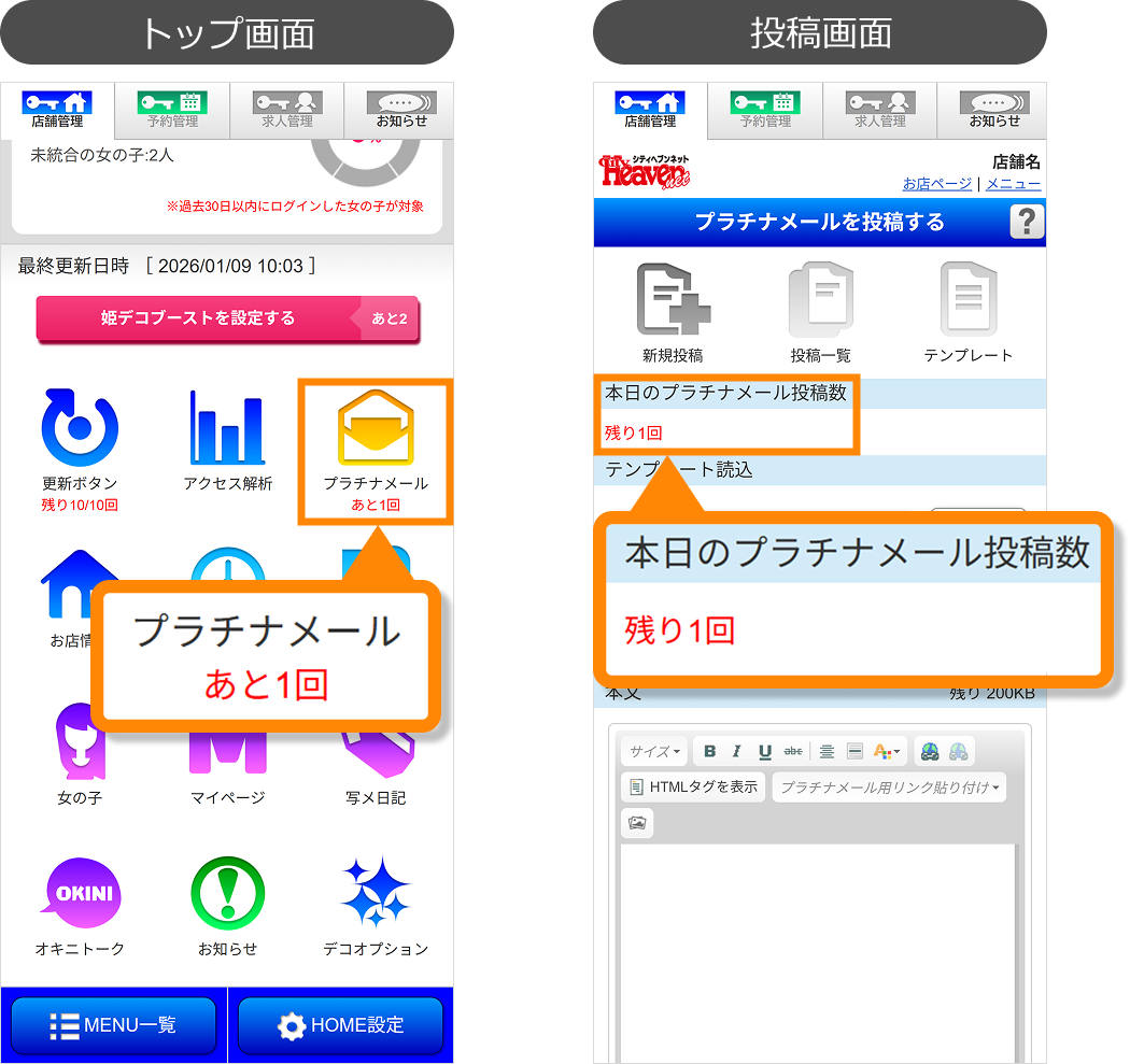 スマホ版マネージャーの「トップ画面」、プラチナメールの「投稿画面」に、本日送信できるプラチナメールの投稿数を表示します。