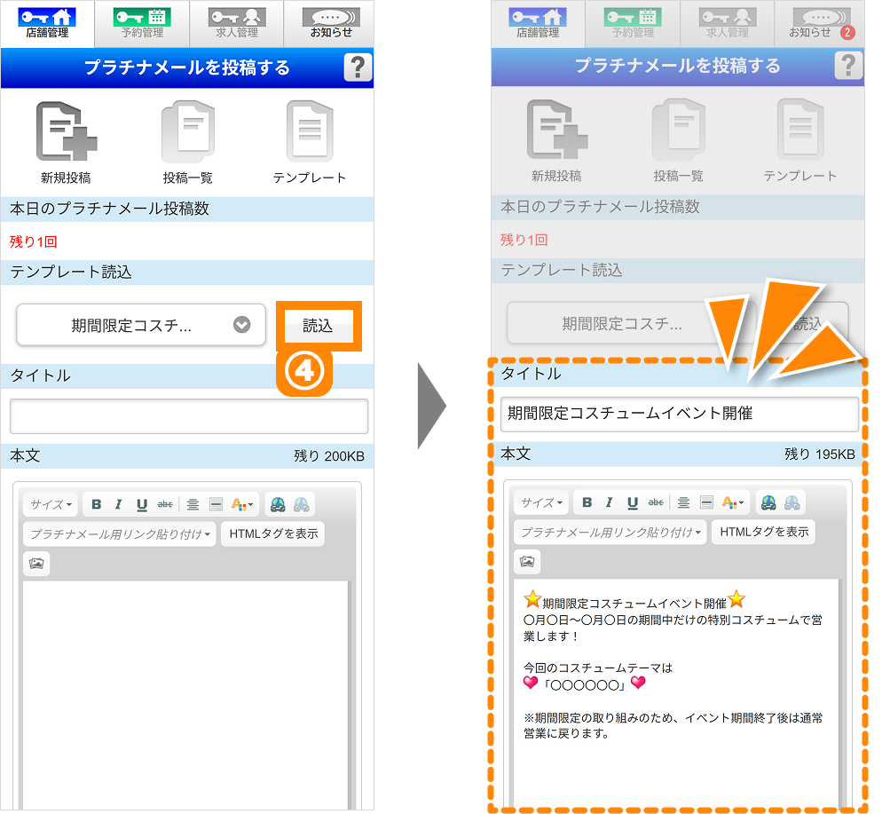 ④.[読込]ボタンを押すと、タイトルと本文にテンプレート内容が反映されます。