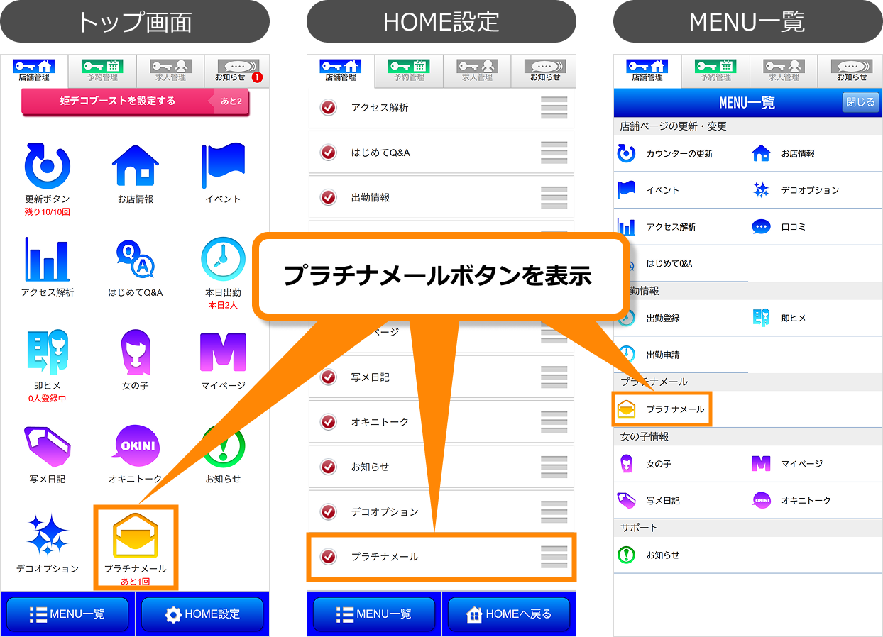 スマホ版マネージャーの「トップ画面」「HOME設定」「MENU一覧」にプラチナメールボタンを表示します。