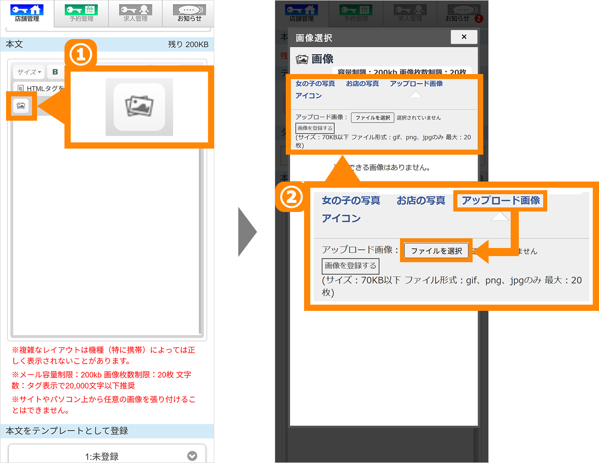 ②.[アップロード画像]⇒[ファイルを選択]を押します。