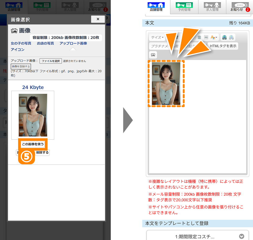 ⑤.[この画像を使う]を押すことで、本文に画像が挿入されます。