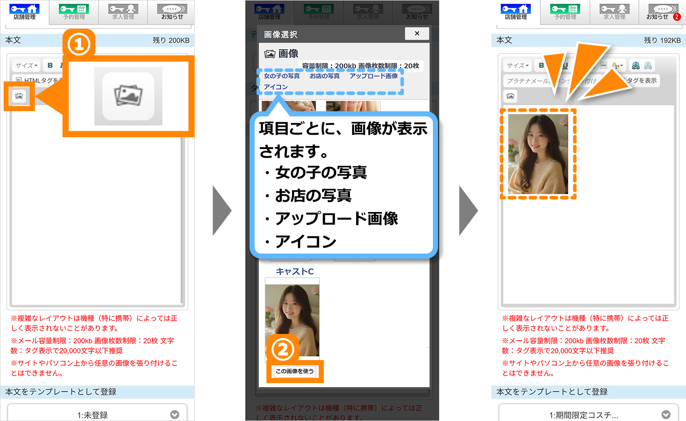 お店様のメール会員に向けて、新人キャストの入店情報やイベント情報などを一斉配信できます。