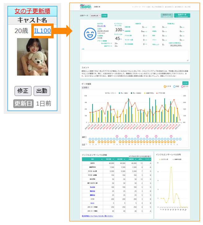 ヘブンネットの持つ豊富なデータを用い、『コンテンツ活用』・『キャストのモチベーション(満足度)』・『アクセス数』などの多方面からお店のマネジメントをサポートするツールです。