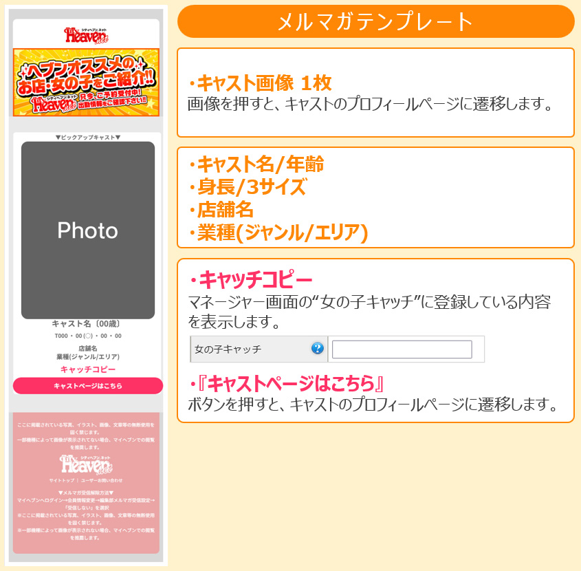 マガジン365のテンプレートに、お店様(キャスト)の情報を登録してメルマガを作成します。