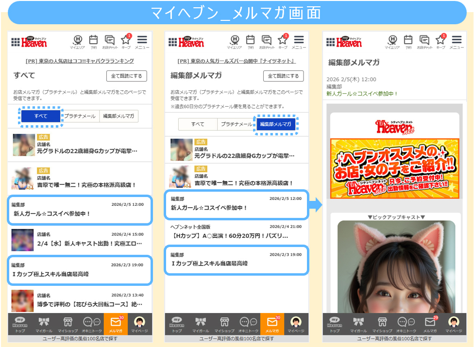 ヘブン会員ページのメルマガ受信設定で『マイヘブンで受け取る』設定をしているユーザーには、マイヘブンのメルマガ画面にも配信されます。