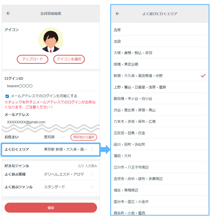 例:下記の画像のユーザーには、[新宿・大久保・高田馬場・中野]を配信先として選択されているお店様のメルマガが届きます。